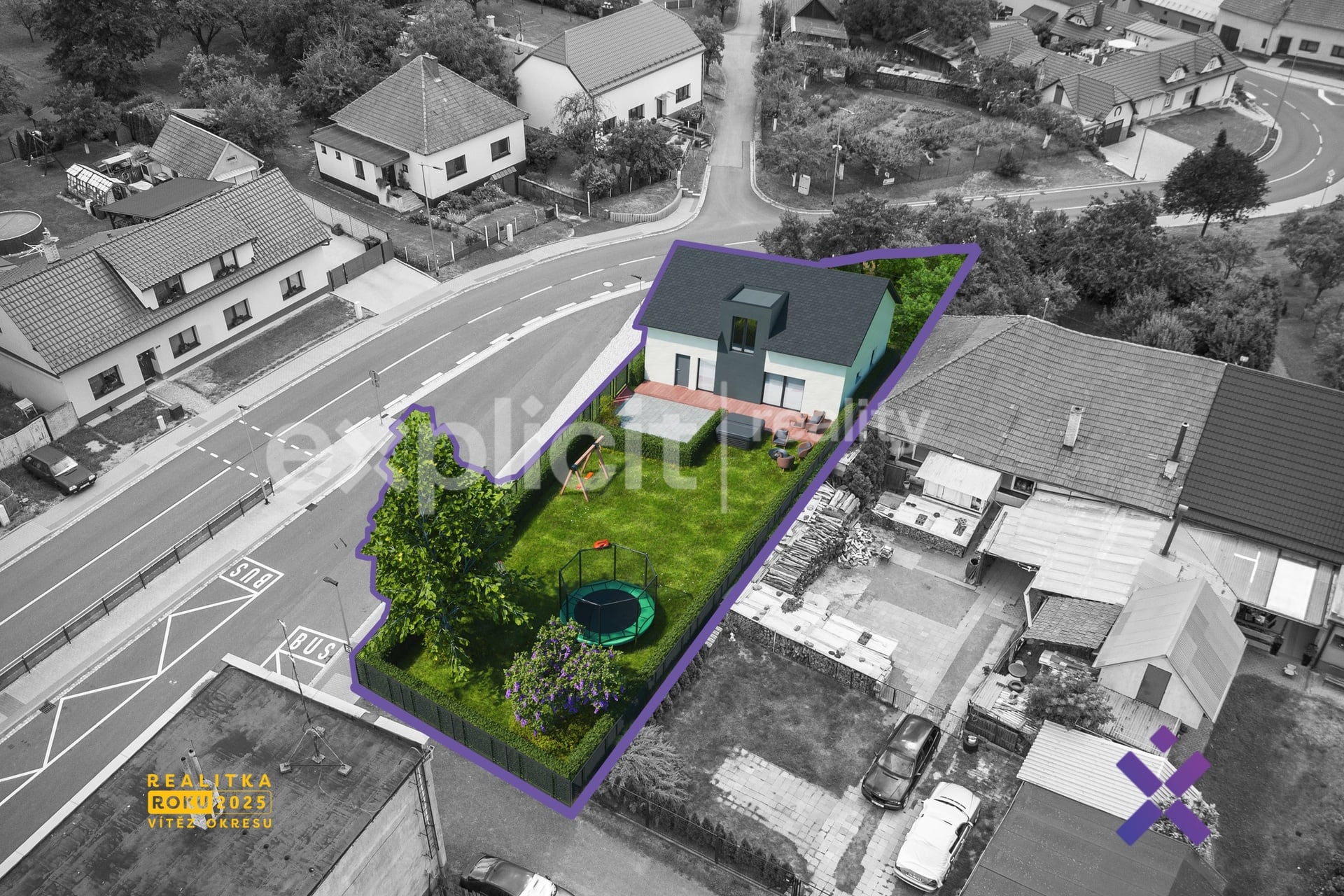 Vizualizace a vyobrazení nemovitosti a pozemku jsou pouze ilustrativní. Závazné údaje o hranicích pozemku jsou uvedeny v katastrální mapě.